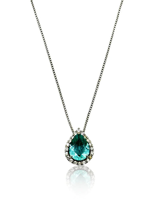 Necklace with a teardrop-shaped Sky Fusion Topaz pendant and a pavé setting.